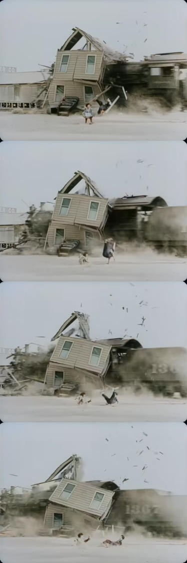 Buster Keaton and Sybil Seely fall, while a train hits their house, from "One Week" (1920)