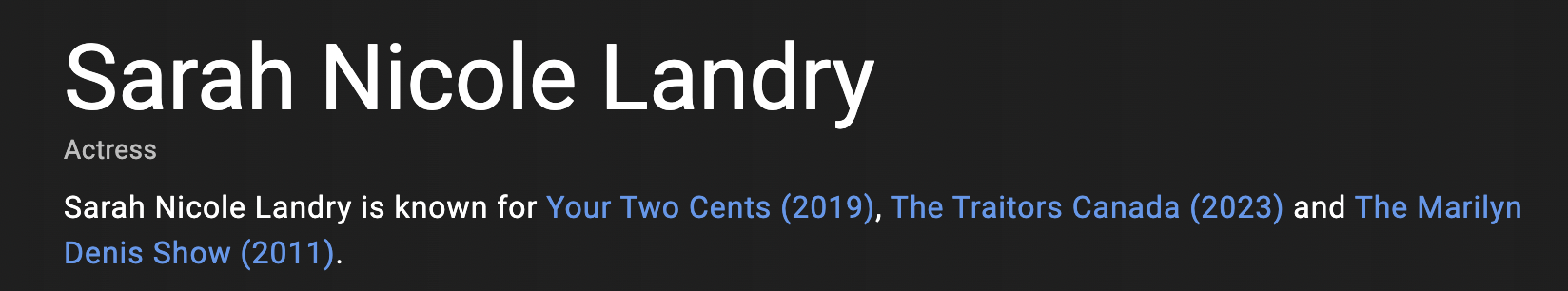 Someone started an IMDb "actress" page; Sarah included her stint on Alicia McCarvell's financial podcast (the one that gets 2-4 views).
