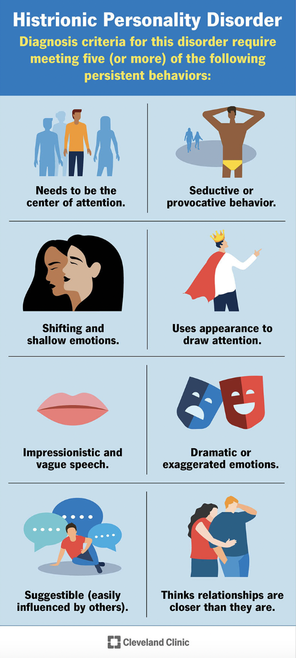 Diagnosis: Histrionic personality disorder (HPD) is a mental health condition marked by unstable emotions, a distorted self-image, and an overwhelming desire to be noticed. People with HPD often behave dramatically or inappropriately to get attention. For people with histrionic personality disorder, their self-esteem depends on the approval of others and doesn’t come from a true feeling of self-worth. They have an overwhelming desire to be noticed and often behave dramatically or inappropriately to get attention.