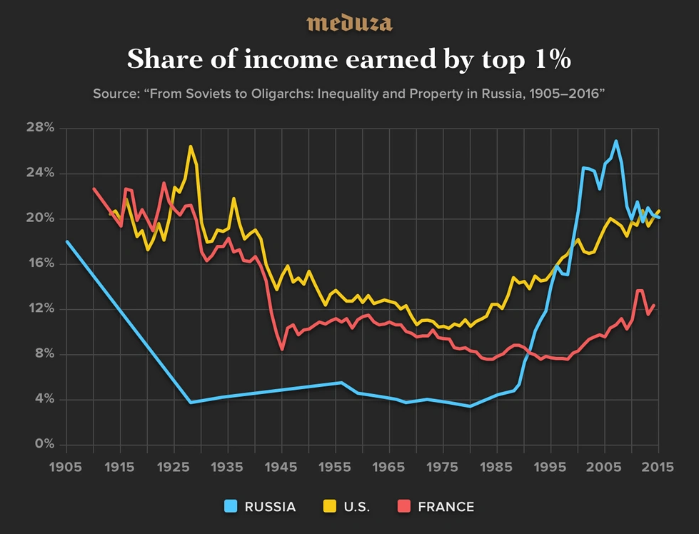 Source for the graph above, hopefully you know Meduza well enough to know that it's not very much aligned with socialism. Wealth inequality has never been lower in any Soviet Union territories as it was during the Soviet Union, not before, not after. In fact, wealth inequality was remarkably low compared to most capitalist countries (again as you see in the graph), and the highest salaries belonged actually not to politicians as you could expect, but to highly trained intellectuals such as University professors or military researchers (my sources for this are Albert Szymanski's "Is the Red Flag Flying" and Robert C. Allen's "Farm to Factory: a Reinterpretation of the Soviet Industrial Revolution). If there were an "owning class vs. working class" dynamic, wouldn't we expect high wealth disparity between workers and "owners", whoever they were? Why, if workers had no say over 70 years in industrial and economic production, was wealth inequality consistently at historic minima and not growing as is the case in proven class-societies such as capitalism (Russia post-1990 per the graph) or feudalism (Russia pre-1929ish per the graph)?