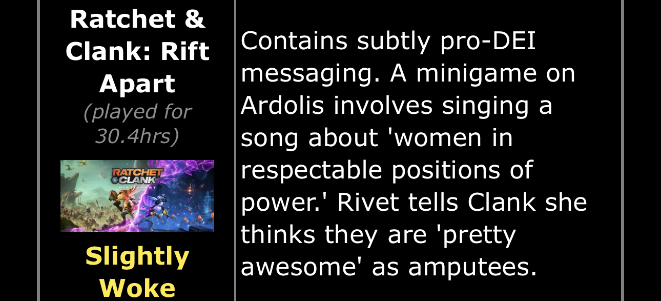 Looked up my list and it’s really curious to see the ratings for my favorite games. Some games were marked “woke” for things I absolutely wouldn’t have thought of, while in other games I think some of the messaging flew over their heads.