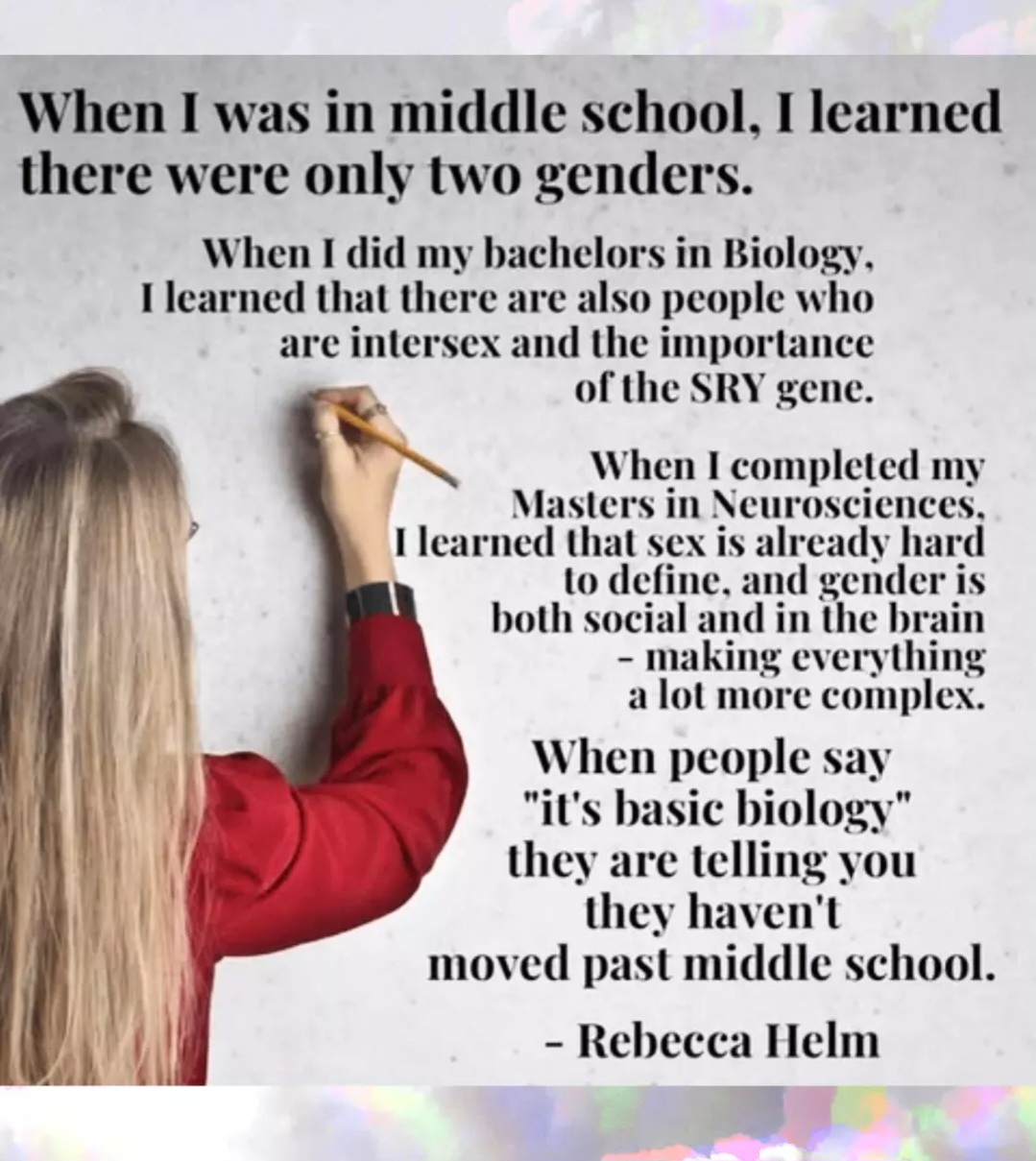 You don’t need a university classroom to teach you about gender or sex or being a decent human being. All of this information is readily available to the public, in fact, if it takes a Masters or PhD to understand what is yes- in fact basic biology and gender theory, then you’re doing something wrong. And by basic I mean, human biological sex can also be complex and gender is a social construct. It’s an afternoon course not six plus fucking years of schooling.
