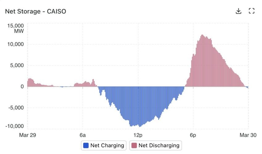 This is another view on what happened on Sunday in California. Batteries charged heavily throughout the day, soaking up the excess solar, approaching charging rates of 10 GW at times. In the evening, most of the output was centred on the early evening peak, but batteries supplied a significant share throughout the evening.
