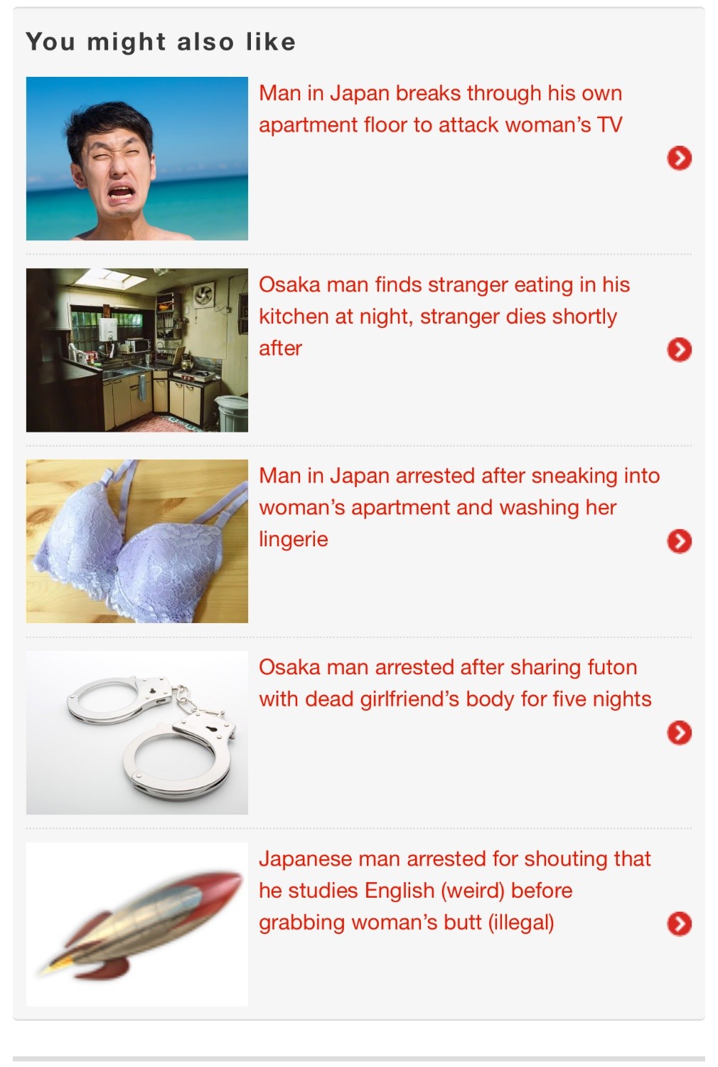- Japanese man arrested for shouting that he studies English (weird) before grabbing woman’s butt (illegal)