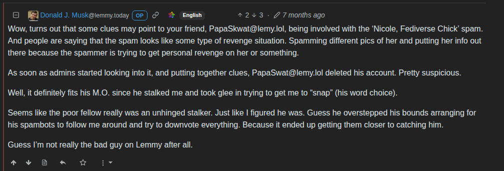 The account is 2 days old, beelined to post to your community as soon as it was created, shares the specific name of a bot building troll, and is now creating accounts on other servers to post and comment nearly exclusively in this comm and DonaldJMusk's comms. The writing's on the wall.
