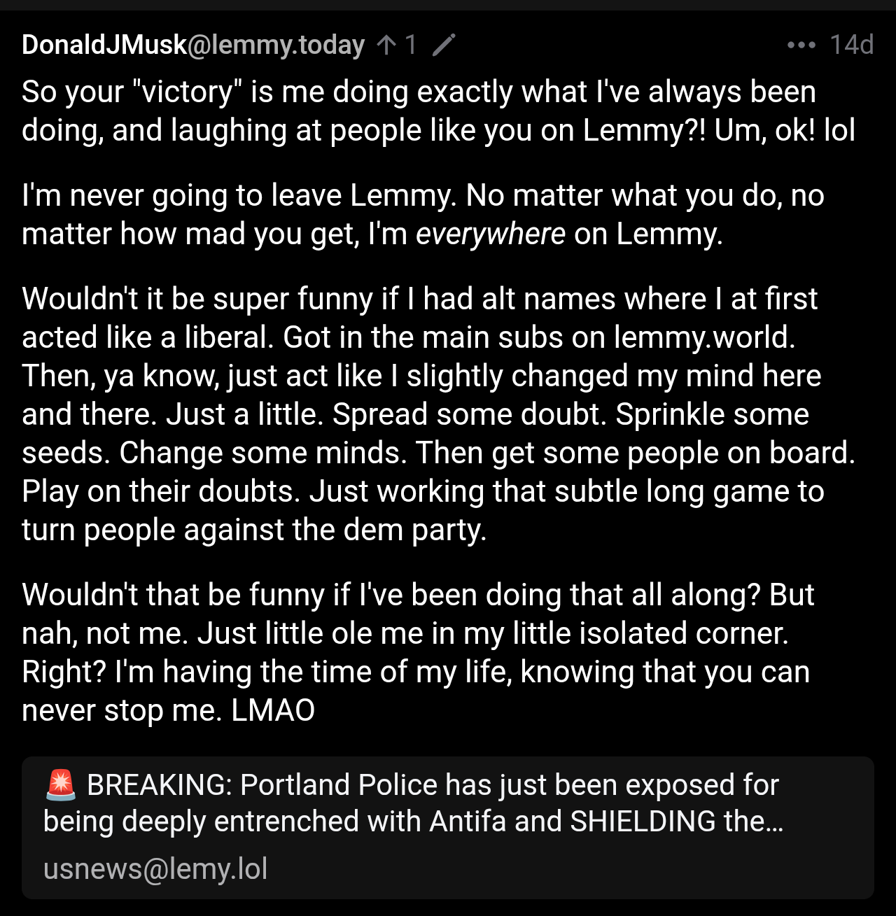 Please tell me about your unique name. How'd you come up with it? And why did such a unique name already exist on Lemmy MONTHS before you joined? Are you aware your name sake is accused of developing a massive bot army? Of course you are because that bot army supposedly targeted you, DonaldJMusk.