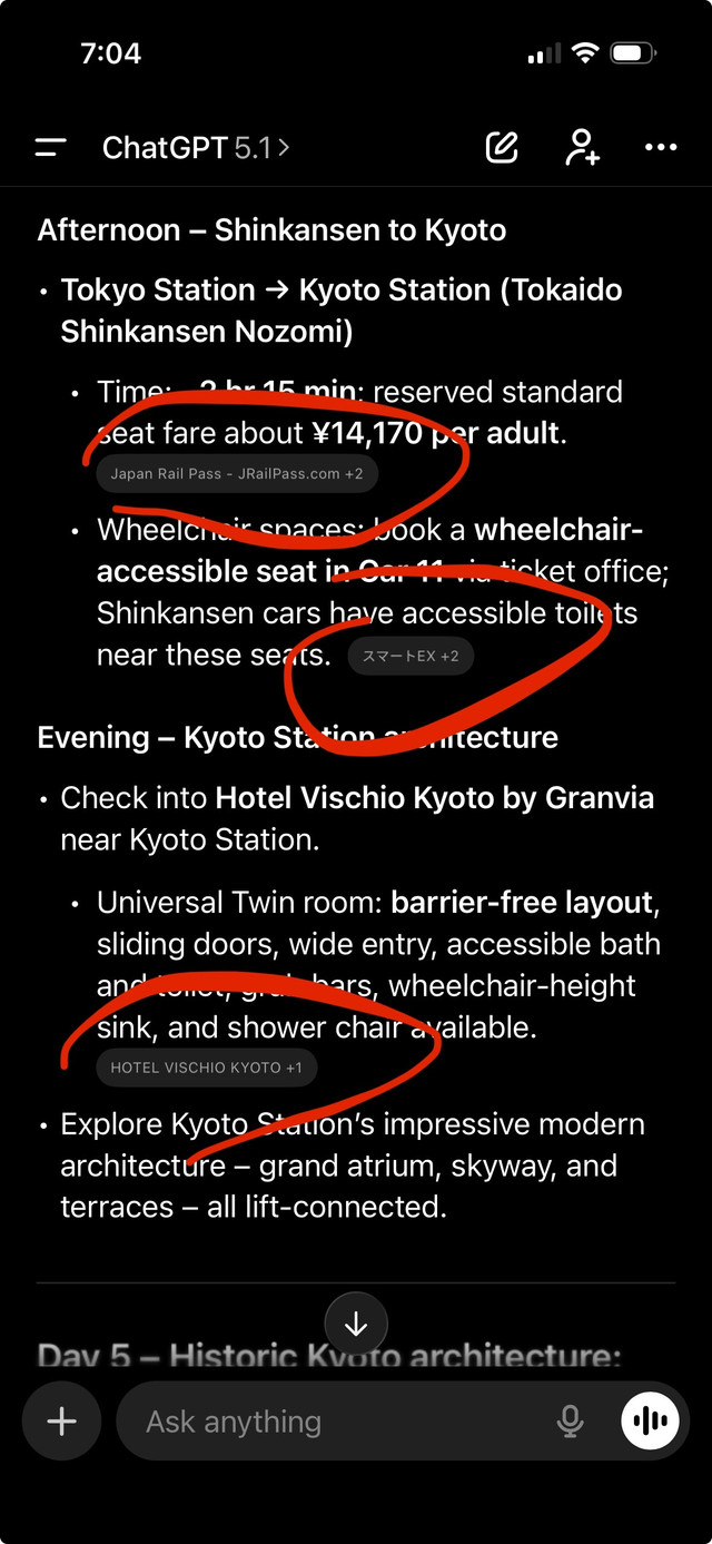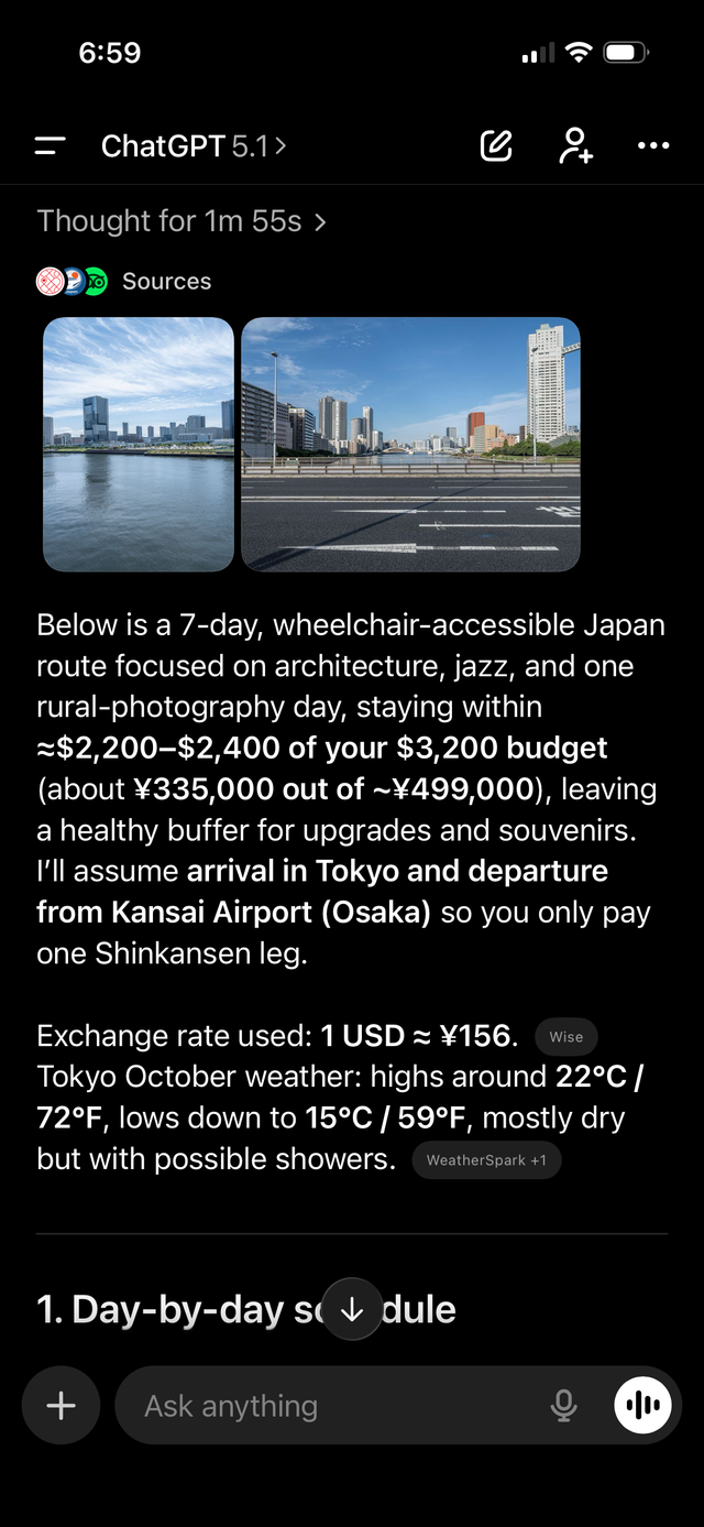 Obviously, I would never jump on a plane with just the response from AI, but I think this is a pretty good start for planning a vacation. It doesn’t seem to show up here but includes a bunch of links.